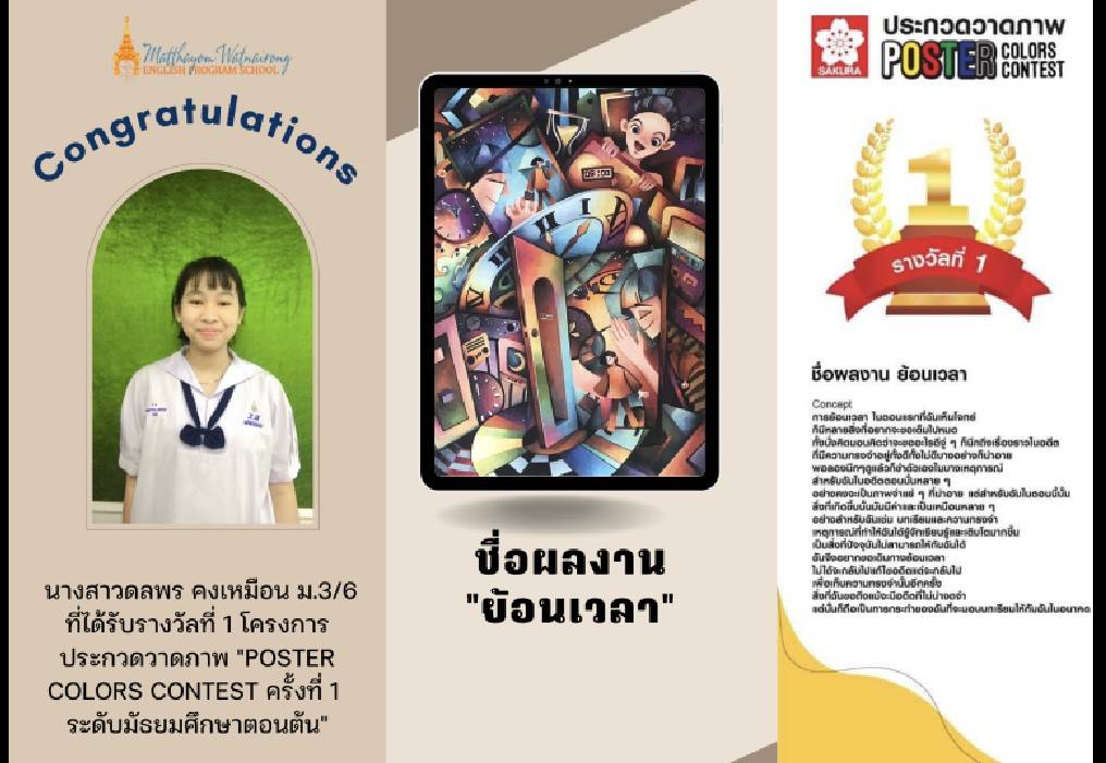 🎊ขอแสดงความยินดี🎊 นางสาวดลพร คงเหมือน นักเรียนชั้นมัธยมศึกษาปีที่ 3/6 ได้รับรางวัลที่ 1 การประกวดวาดภาพระดับชั้นมัธยมศึกษาตอนต้น
