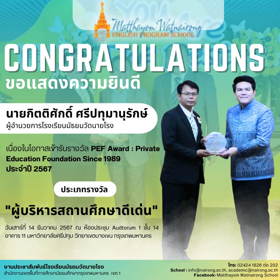 ขอแสดงความยินดี นายกิติศักดิ์ ศรีปทุมานุรักษ์ ผู้อำนวยการโรงเรียนมัธยมวัดนายโรง เข้ารับรางวัล PEF Award : Private Education Foundation Since 1989 ประจำปี 2567