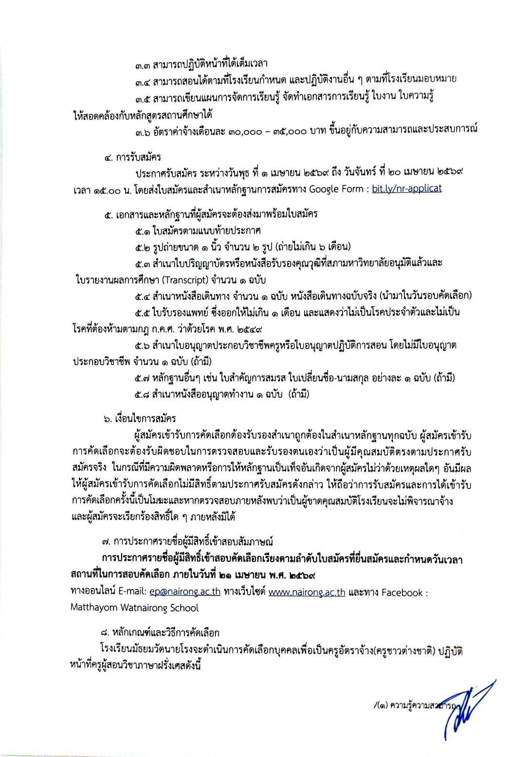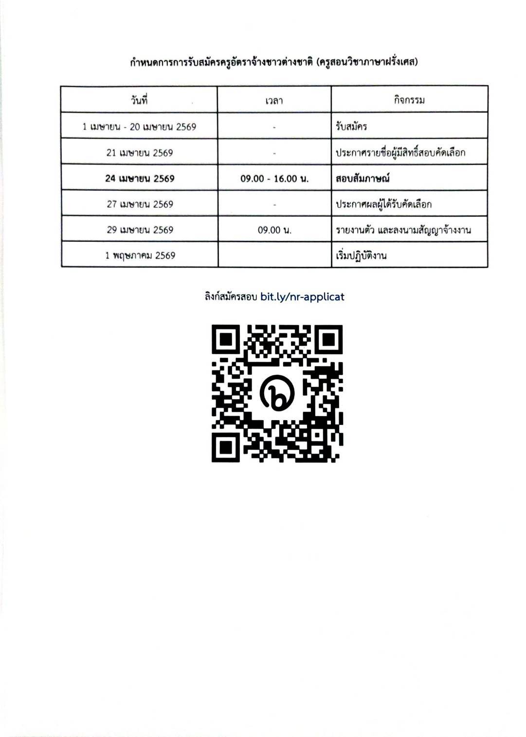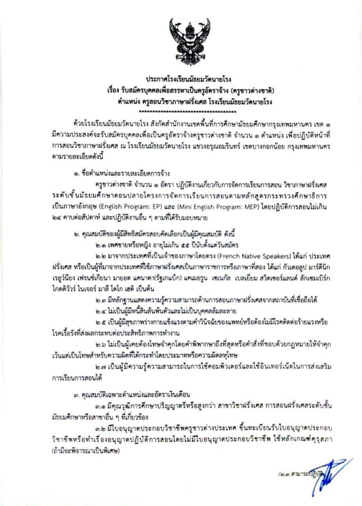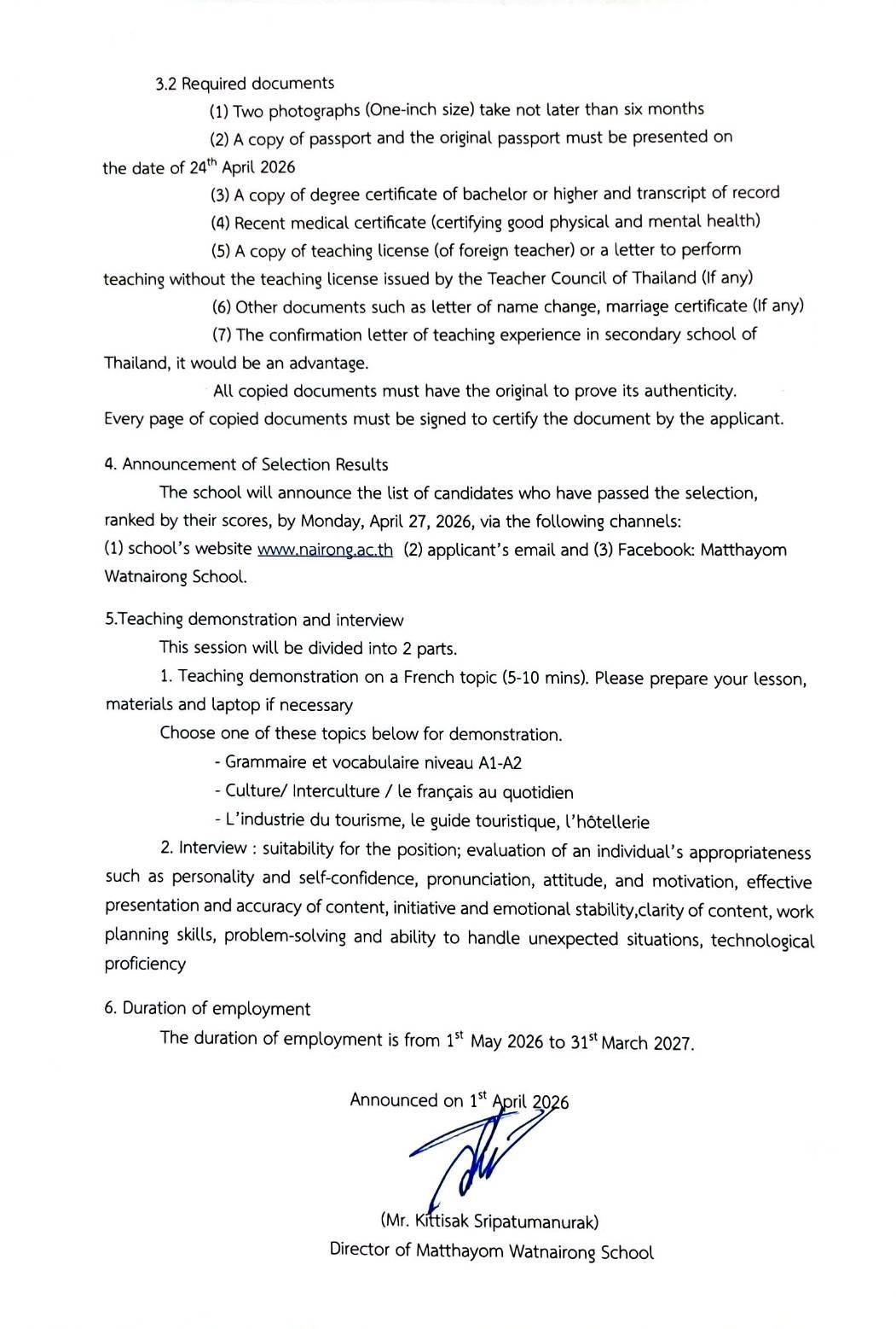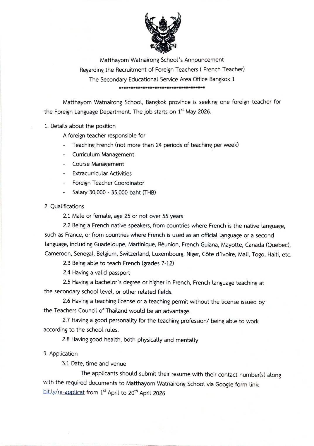 ประกาศรับสมัครบุคคลเพื่อสรรหาเป็นครูอัตราจ้าง (ครูชาวต่างชาติ) ตำแหน่ง ครูสอนวิชาภาษาฝรั่งเศส