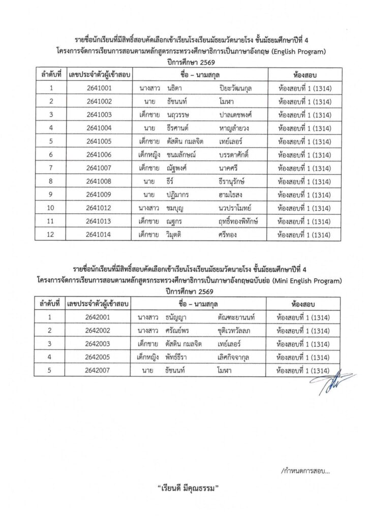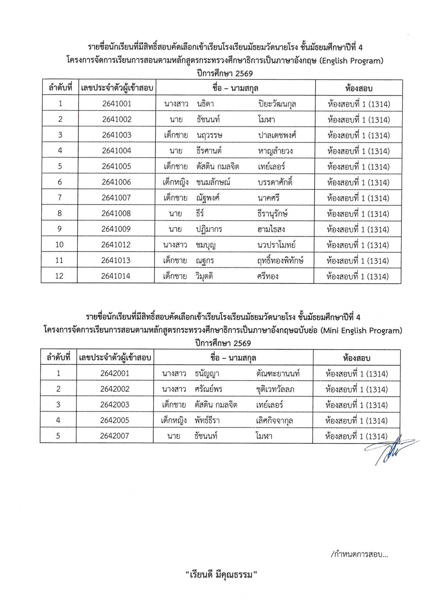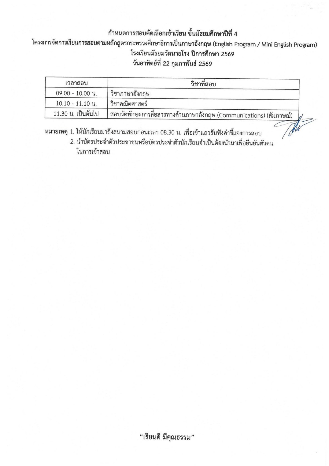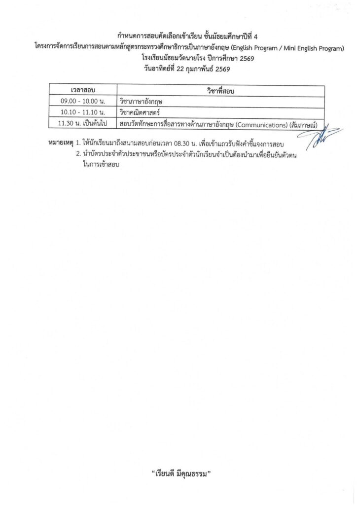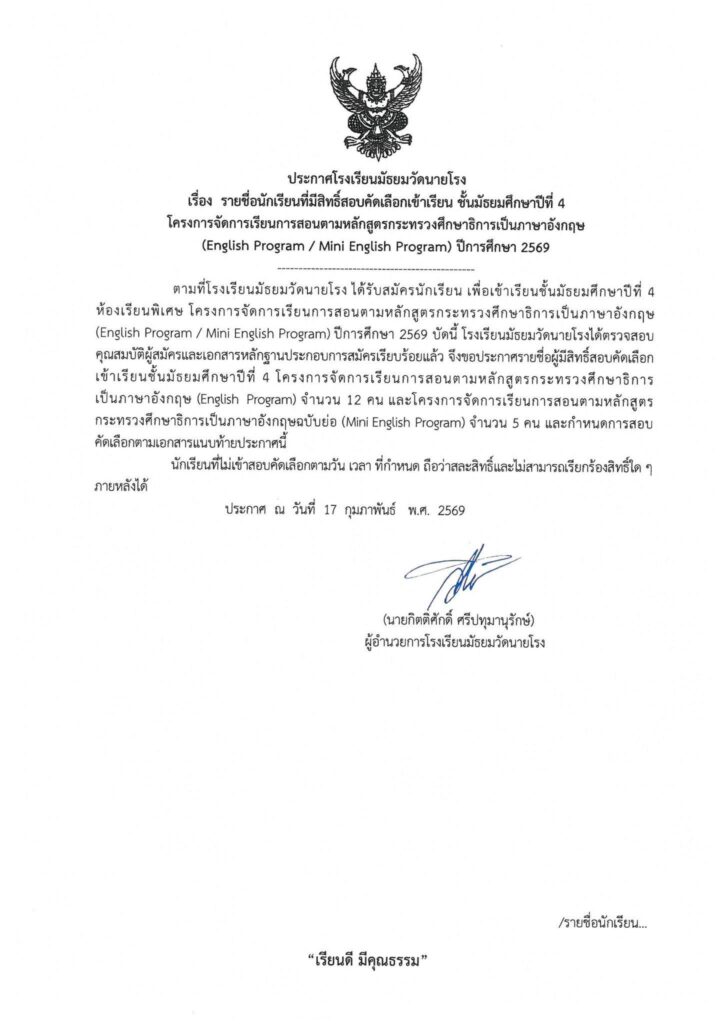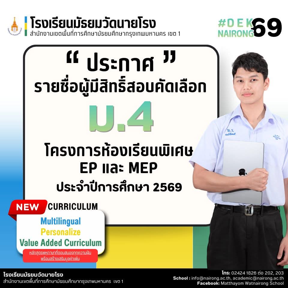 ประกาศรายชื่อผู้มีสิทธิ์สอบคัดเลือกเข้าศึกษาต่อชั้นมัธยมศึกษาปีที่ 4 English Program (EP) & Mini English Program (MEP) ปีการศึกษา 2569