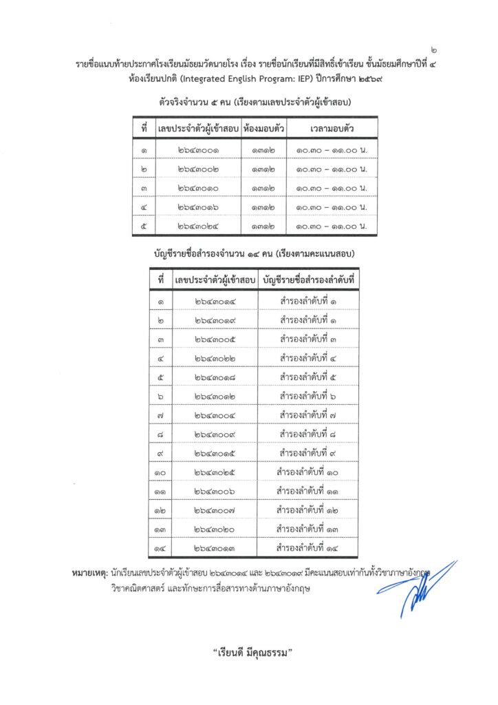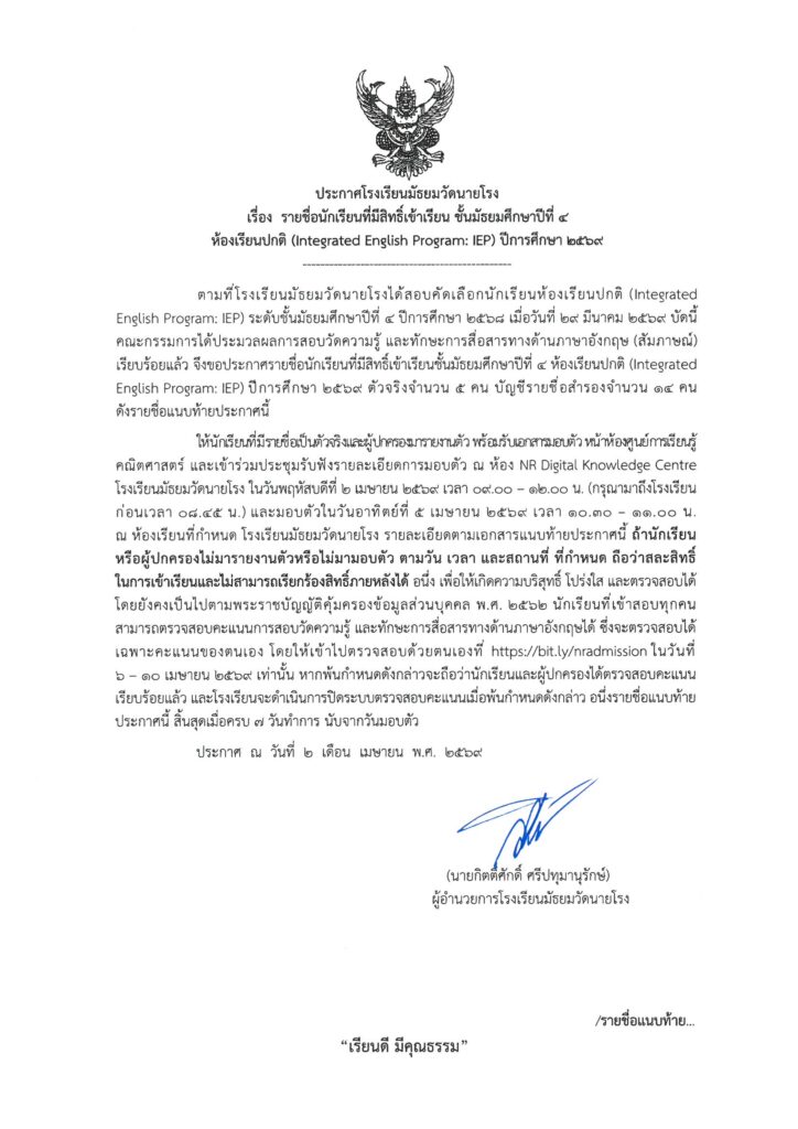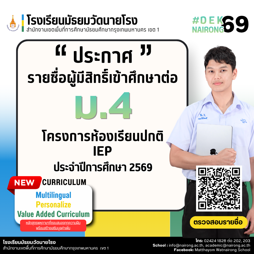 ประกาศรายชื่อผู้มีสิทธิ์เข้าศึกษาต่อ ม.4 โครงการห้องเรียนปกติ IEP ปีการศึกษา 2569