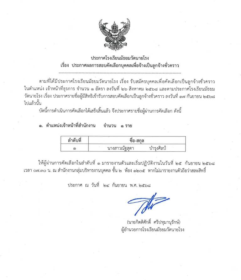 ประกาศโรงเรียนมัธยมวัดนายโรง เรื่อง ประกาศผลการสอบคัดเลือกบุคคลเพื่อจ้างเป็นลูกจ้างชั่วคราว ตำแหน่ง เจ้าหน้าที่สำนักงาน